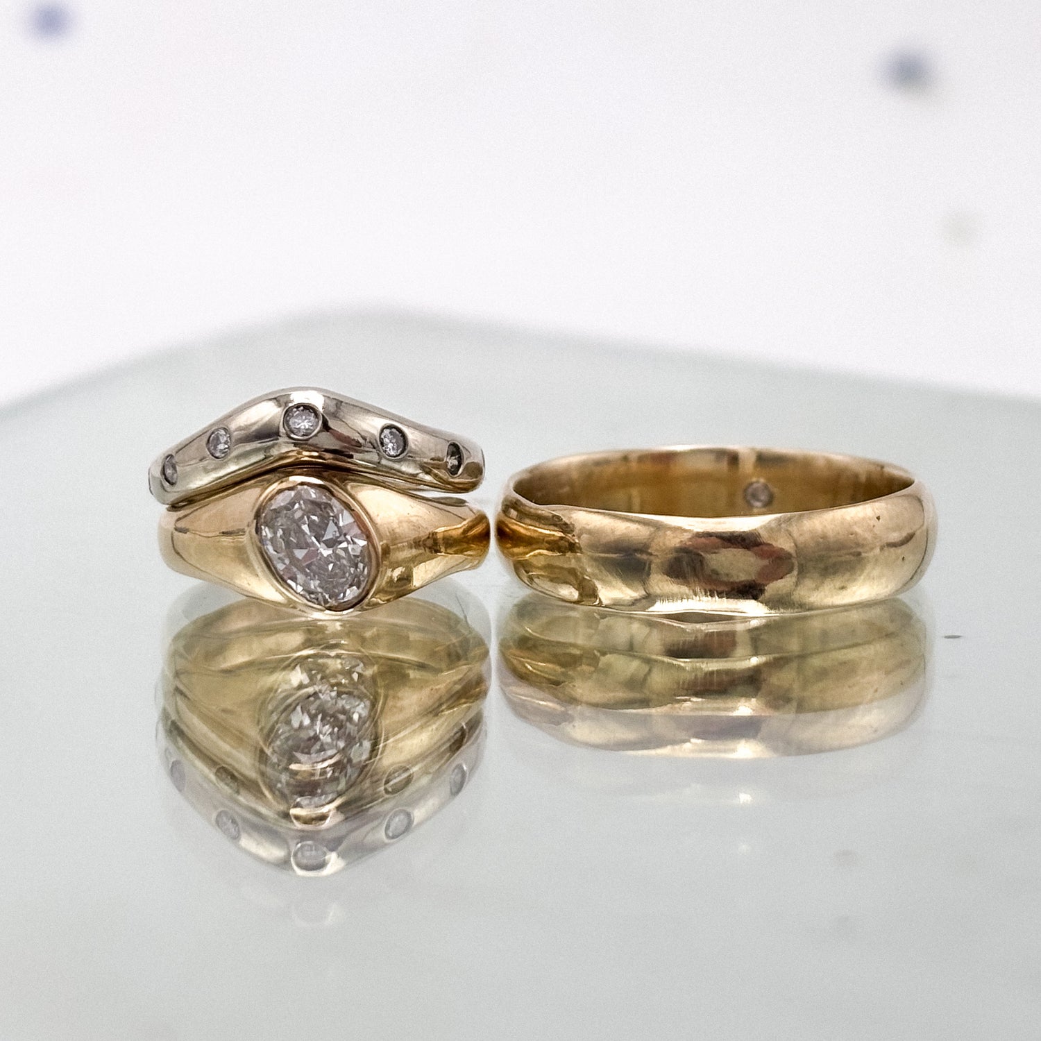 These one-of-a-kind rings were designed in collaboration with our couple and created using their heirloom gold and diamonds. White and yellow gold bridal nesting set, and a groom's band crafted to match with a hidden diamond on the inside of the band. A dream project!