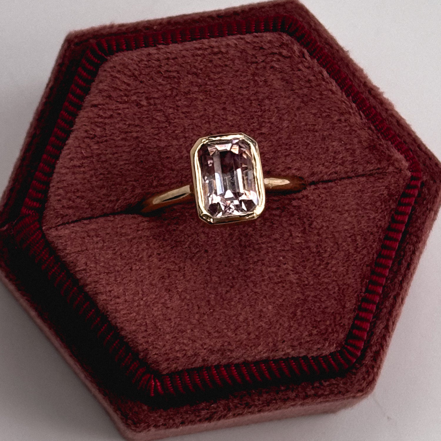 Sarah wanted a light pink, chunky emerald cut Morganite for her ring. One of our trusted vendors was ready to source and cut this stone for us to her specs. The band and setting are made with gold she provided me to be re-formed. We love making the things you can't find anywhere else.