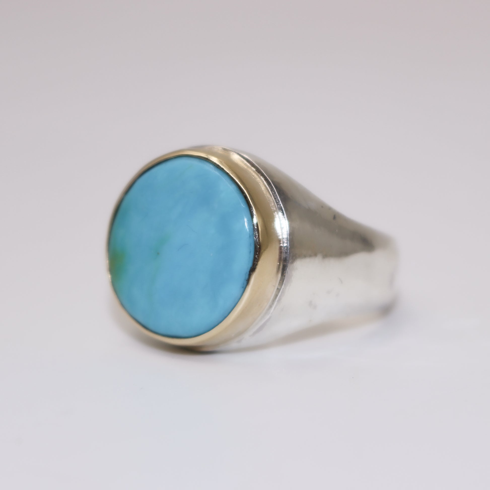 A heavy sterling silver signet with an incredible piece Kingman turquoise set in a 10k yellow gold bezel. Size 10.