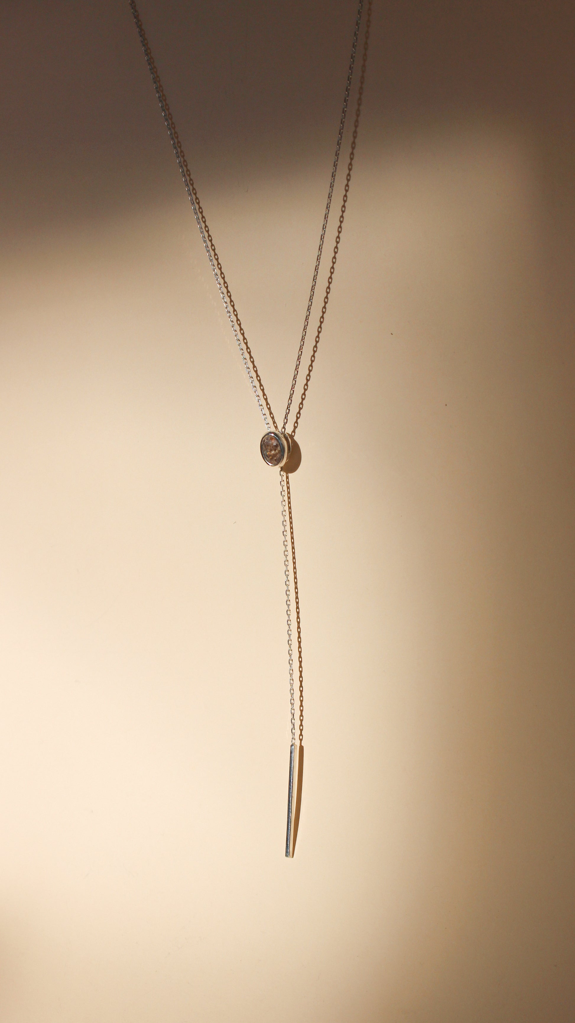 One of my favorite pieces! The perfect lariat made with sterling silver and a soft peach spinel. Chain is 21” with a 3” dangle from the center