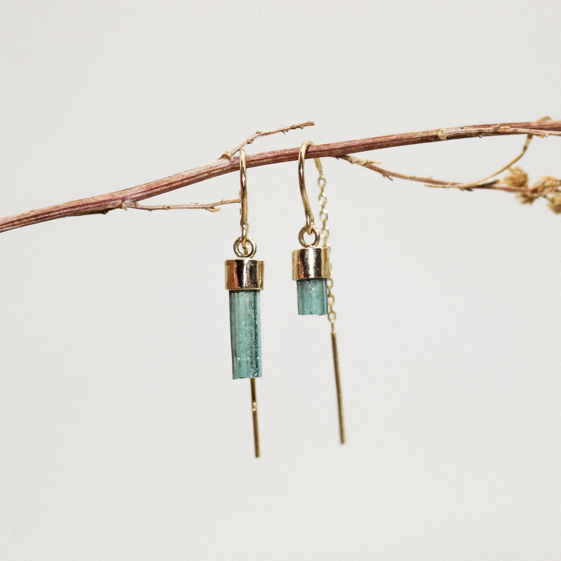 Beautifully rough around the edges and at the same time delicate. Raw tourmaline set in 10k gold, on 14k threaders. One of a kind, sold individually.