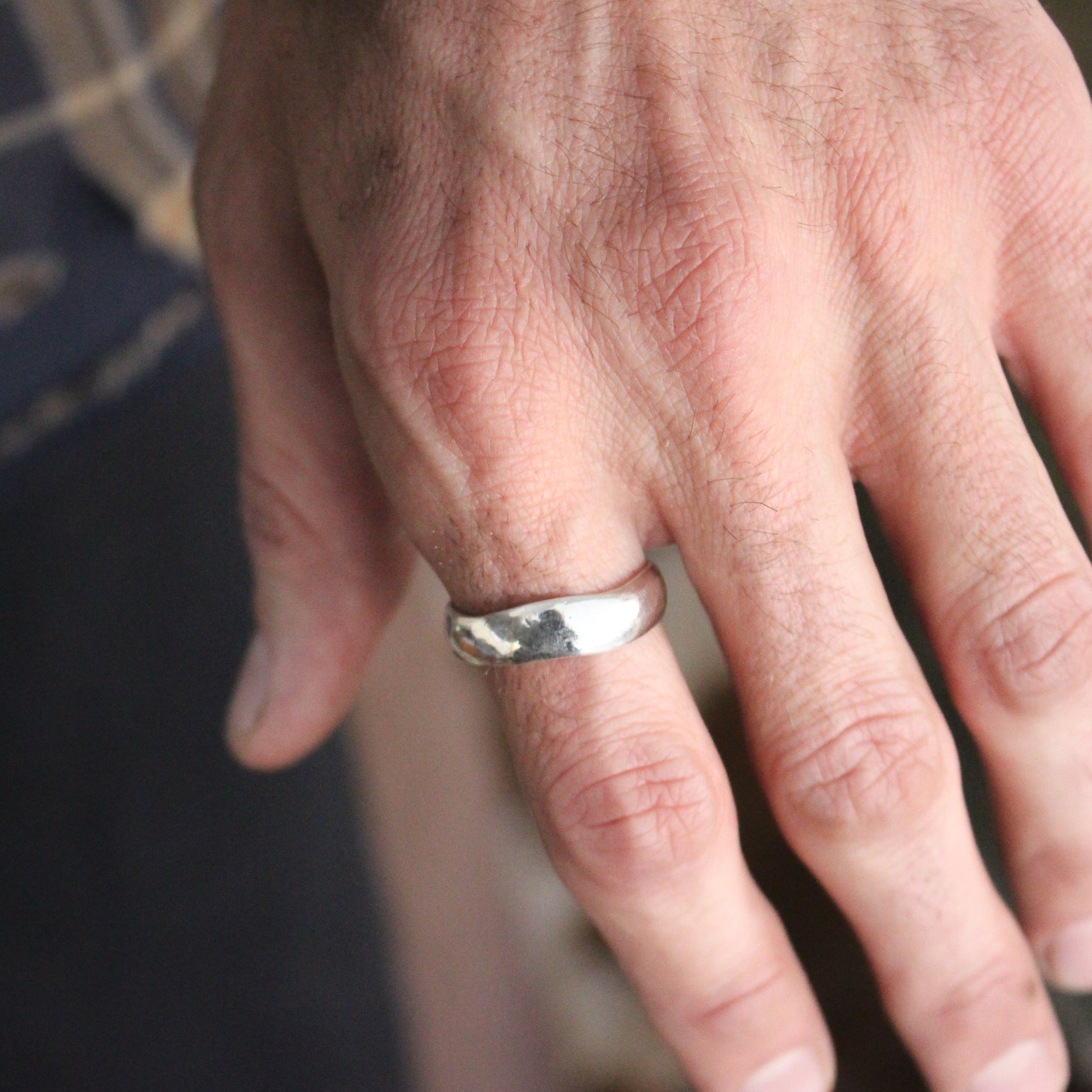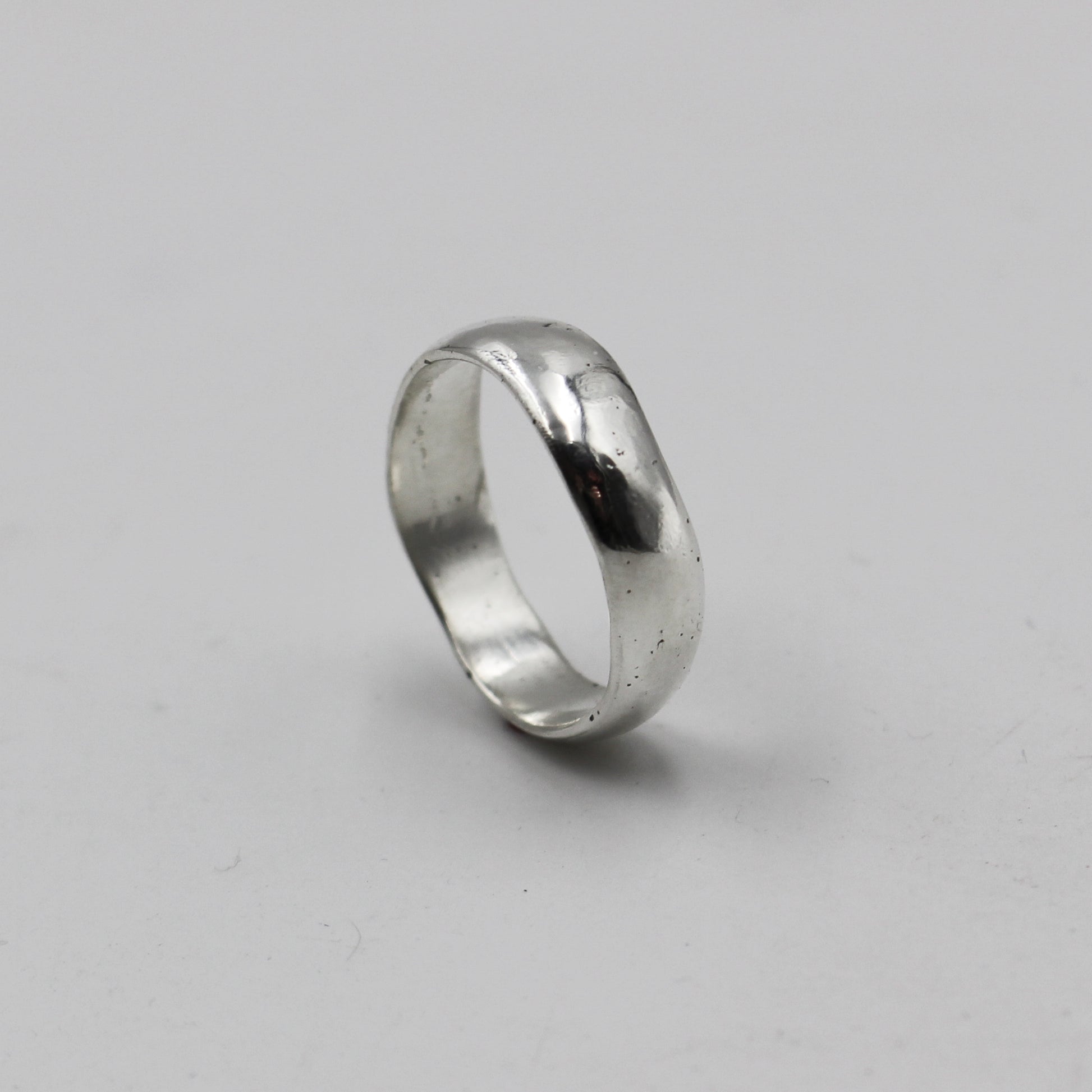 A solid, heavy sterling silver band with an organic edge and unique characteristics from casting.