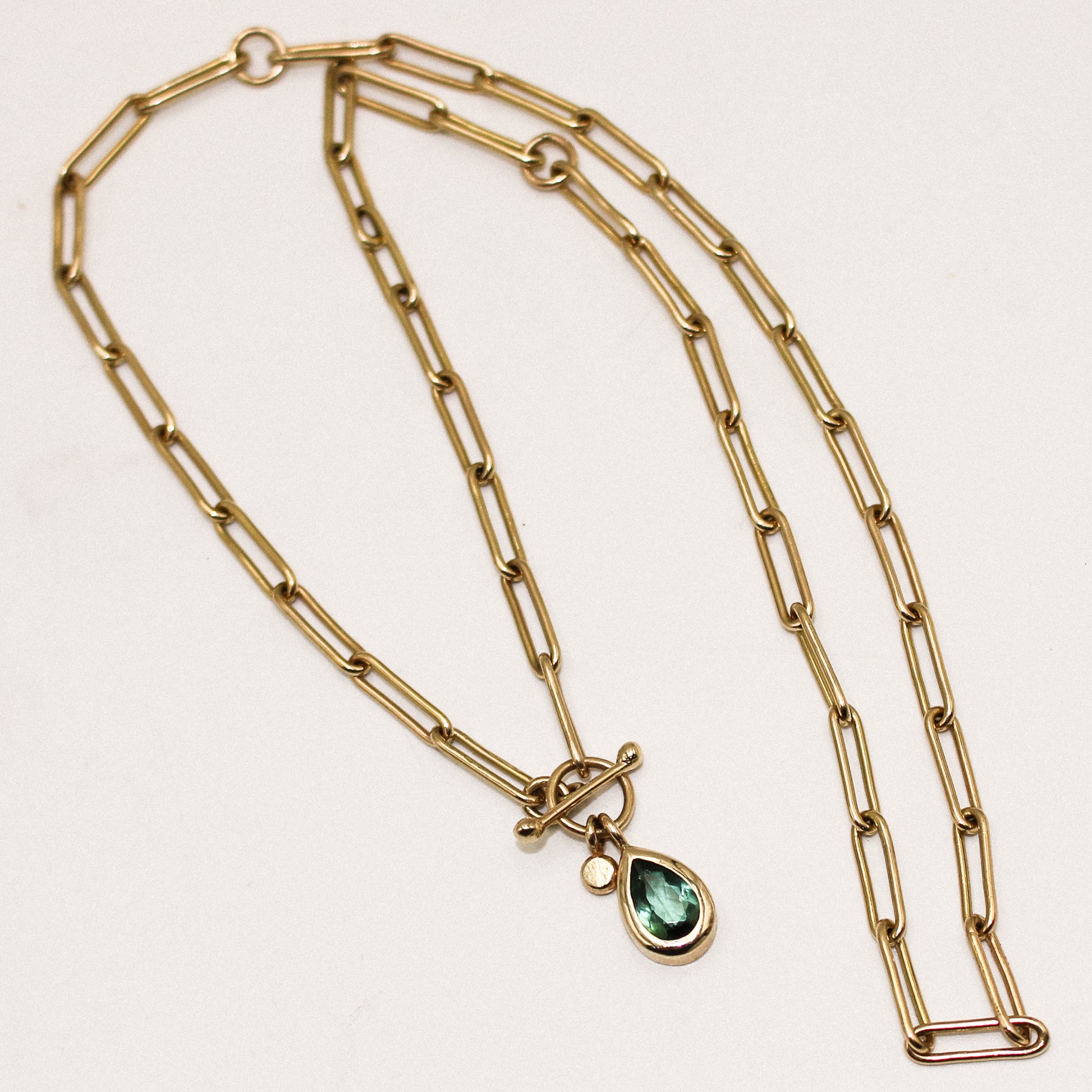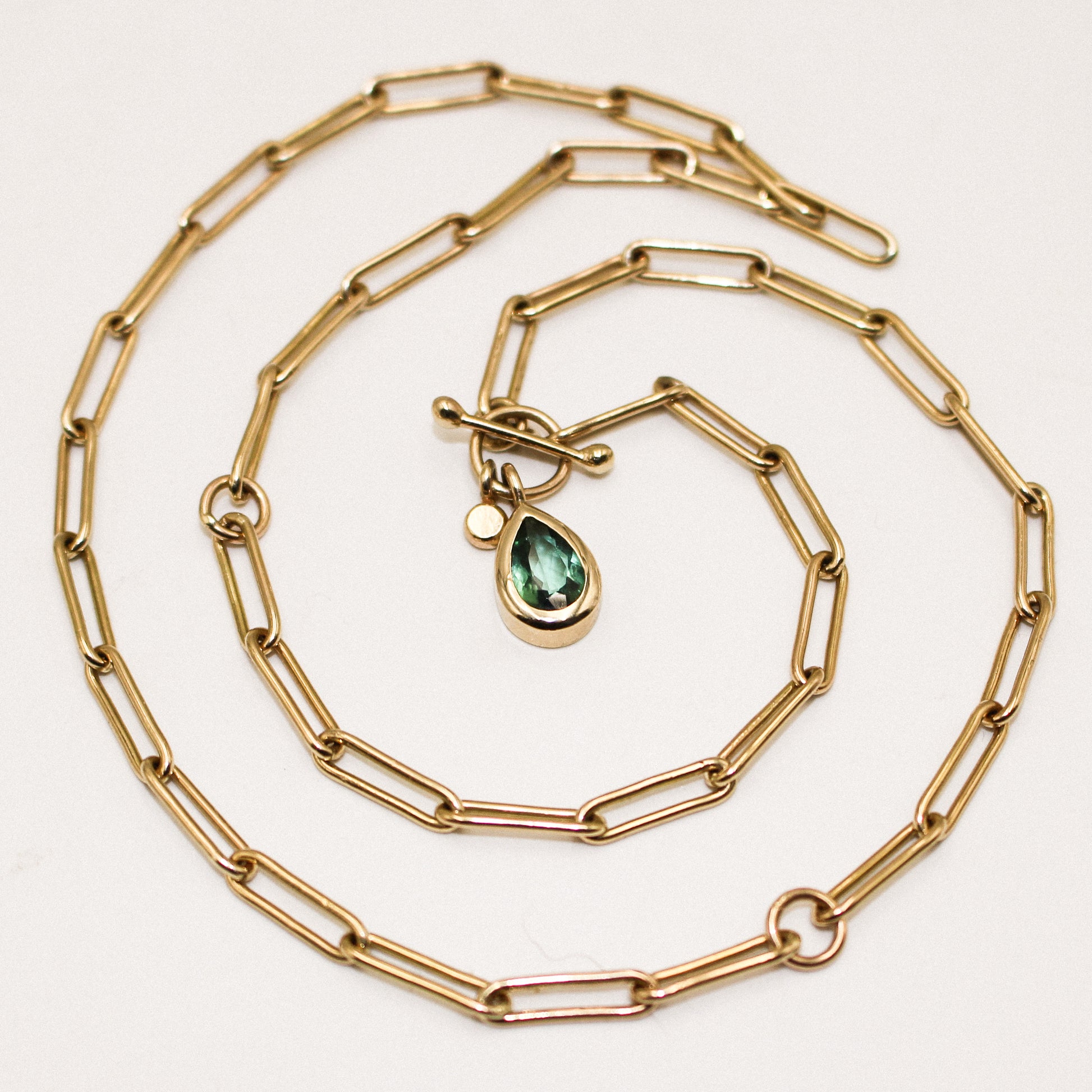 Handmade paperclip chain with front toggle clasp and gorgeous teardrop-shaped green blue tourmaline in a chunky bezel setting. Made in solid 14k gold.